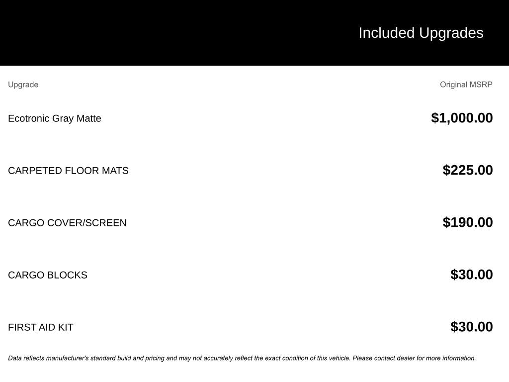 Price does not include Patriot Package, Dealer Installed Accessories, Dealer Documentation Fee, State/Local Taxes or additional fees. These fees are extra. Price and availability is intended for in state or local servicing customers that have a qualified retail trade and secure financing arranged by dealer through a dealer chosen lender at standard market rates. Price and availability subject to change without notice. See Dealer for Details. Price includes: