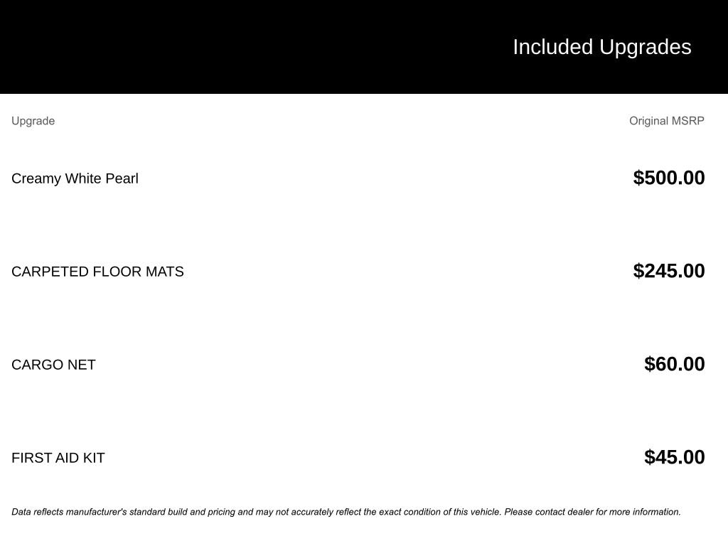 Dealer not responsible for typographical errors. Pictures are for illustration purposes only. All vehicles subject to prior sales. See dealer for details. MSRP may not be price at which vehicle is sold in trade area. New car prices include applicable manufacturer incentives in lieu of special financing. Plus tax, title, license Price includes: Not all customers qualify for all rebates. See dealer for details.