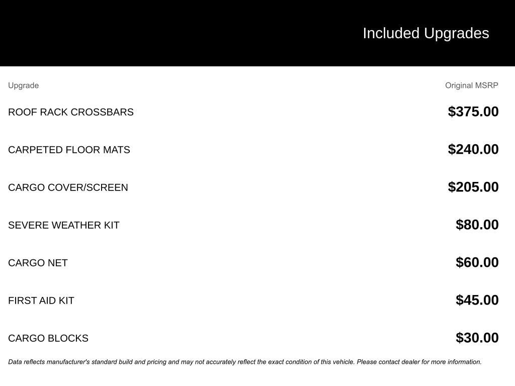 Price does not include Patriot Package, Dealer Installed Accessories, Dealer Documentation Fee, State/Local Taxes or additional fees. These fees are extra. Price and availability is intended for in state or local servicing customers that have a qualified retail trade and secure financing arranged by dealer through a dealer chosen lender at standard market rates. Price and availability subject to change without notice. See Dealer for Details. Price includes:
