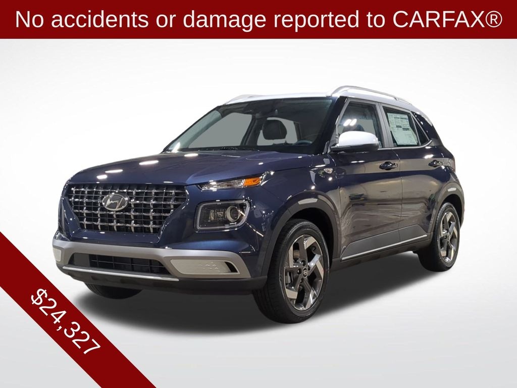 Option Group 01, Venue Limited, 4D Sport Utility, I4, FWD, Denim w/White Roof, Denim Cloth, 4-Wheel Disc Brakes, 6 Speakers, 6.5J x 17" Alloy Wheels, ABS brakes, Air Conditioning, All-Season Fitted Liners, Alloy wheels, AM/FM radio: SiriusXM, Apple CarPlay & Android Auto, Auto High-beam Headlights, Automatic temperature control, Brake assist, Bumpers: body-color, Carpeted Floor Mats, Cloth & Leatherette Seat Trim, Delay-off headlights, Driver door bin, Driver vanity mirror, Dual front impact airbags, Dual front side impact airbags, Electronic Stability Control, Emergency communication system, First Aid Kit, Front anti-roll bar, Front Bucket Seats, Front Center Armrest, Front reading lights, Front wheel independent suspension, Fully automatic headlights, Heated door mirrors, Heated Front Bucket Seats, Heated front seats, Illuminated entry, Leather Shift Knob, Leather steering wheel, Low tire pressure warning, Navigation System, Occupant sensing airbag, Outside temperature display, Overhead airbag, Overhead console, Panic alarm, Passenger door bin, Passenger vanity mirror, Power door mirrors, Power steering, Power windows, Radio: AM/FM/HD/SiriusXM w/Navigation System, Rear Seat Cup Holder, Rear window defroster, Rear window wiper, Remote keyless entry, Reversible Cargo Tray, Security system, Speed control, Speed-sensing steering, Split folding rear seat, Spoiler, Steering wheel mounted audio controls, Tachometer, Telescoping steering wheel, Tilt steering wheel, Traction control, Trip computer, and Variably intermittent wipers. CARPLAY, ANDROID AUTO, BLUETOOTH, BACKUP CAMERA, BLIND SPOT ASSIST, Venue Limited, 4D Sport Utility, I4, FWD, Denim w/White Roof, Denim Cloth.