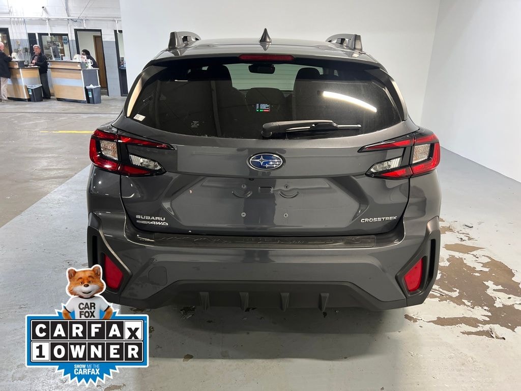 With options like All-Weather Package (Heated Exterior Mirrors, Heated Front Seats, and Heated Wipers), BSD/RCTA & Moonrf & All Weather Pkg & Pwr Dr. Seat (10-Way Power Driver's Seat, Blind Spot Detection w/Rear Cross-Traffic Alert, and Power Moonroof), Crosstrek Premium, 4D Sport Utility, 2.0L 4-Cylinder DOHC 16V, Lineartronic CVT, AWD, Magnetite Gray Metallic, Black Cloth, 3.90 Axle Ratio, 4-Wheel Disc Brakes, 6 Speakers, ABS brakes, Air Conditioning, All-Weather Floor Liners, Alloy wheels, AM/FM radio: SiriusXM, Anti-whiplash front head restraints, Auto High-beam Headlights, Auto-Dimming Exterior Mirror w/Approach Light, Auto-Dimming Mirror w/Compass & HomeLink, Automatic temperature control, Brake assist, Bumpers: body-color, Driver door bin, Driver vanity mirror, Dual front impact airbags, Dual front side impact airbags, Electronic Stability Control, Emergency communication system: STARLINK Safety and Security (Subscription Required), Exterior Parking Camera Rear, Four wheel independent suspension, Front anti-roll bar, Front Bucket Seats, Front Center Armrest, Front dual zone A/C, Front fog lights, Front reading lights, Fully automatic headlights, Illuminated entry, Knee airbag, LED Upgrade, Low tire pressure warning, Occupant sensing airbag, Outside temperature display, Overhead airbag, Overhead console, Panic alarm, Passenger door bin, Passenger vanity mirror, Power door mirrors, Power steering, Power windows, Premium Cloth Upholstery, Radio data system, Radio: Subaru STARLINK 11.6" Multimedia Plus Sys, Rear anti-roll bar, Rear Bumper Cover, Rear Gate Light, Rear seat center armrest, Rear Seatback Protector, Rear window defroster, Rear window wiper, Remote keyless entry, Security system, Speed control, Speed-sensing steering, Split folding rear seat, Spoiler, STARLINK/Apple CarPlay/Android Auto, Steering wheel mounted audio controls, Tachometer, Telescoping steering wheel, Tilt steering wheel, Traction control, Trip computer, Turn signal indicator mirrors, Variably intermittent wipers, Wheels: 17" x 7.0J Dark Gray Aluminum Alloy, and Wireless Charger.